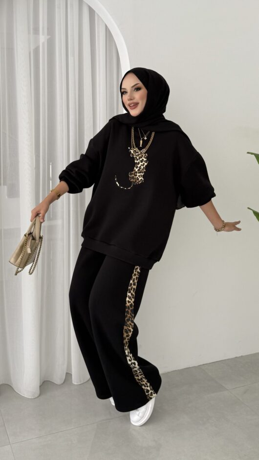 Leopar Nakışlı Şardonlu İkili Takım – Siyah