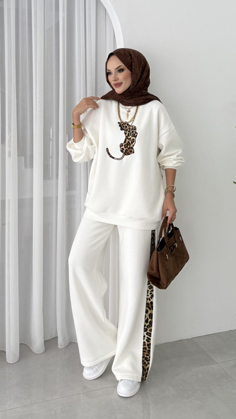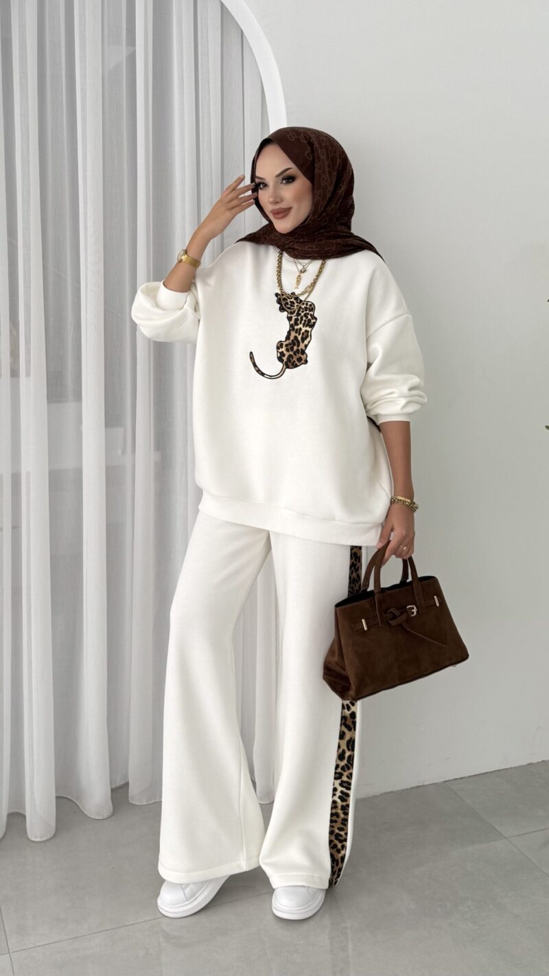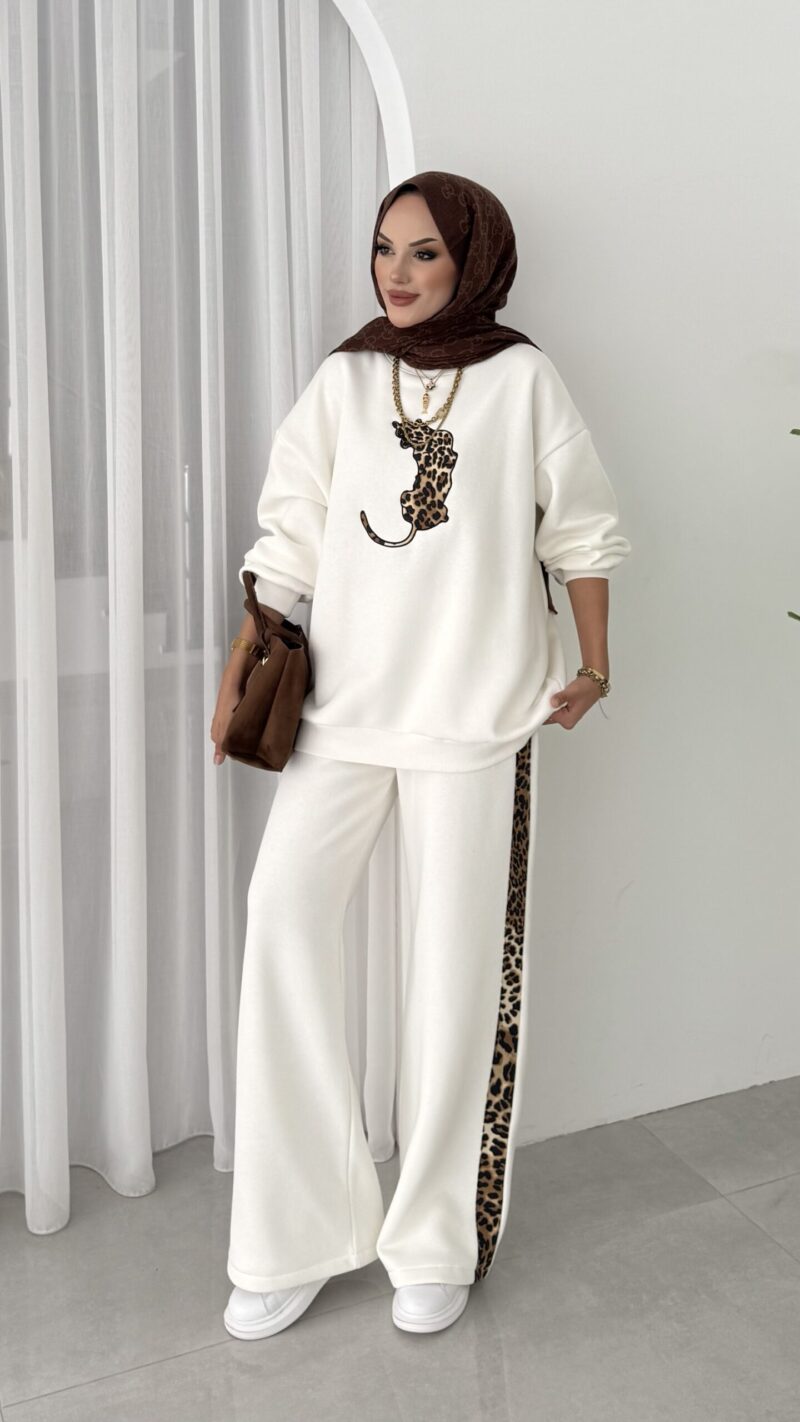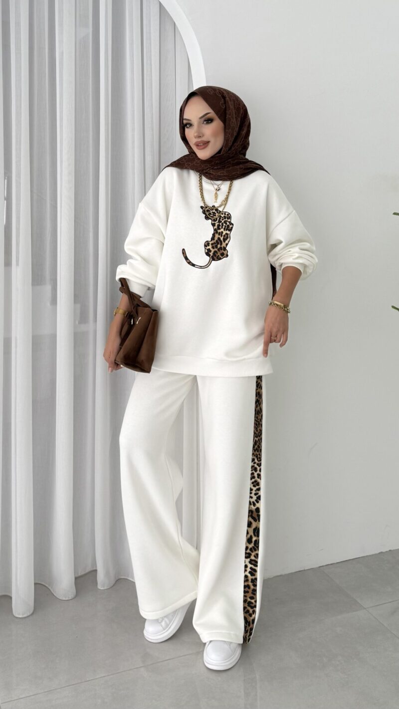 Leopar Nakışlı Şardonlu İkili Takım – Beyaz