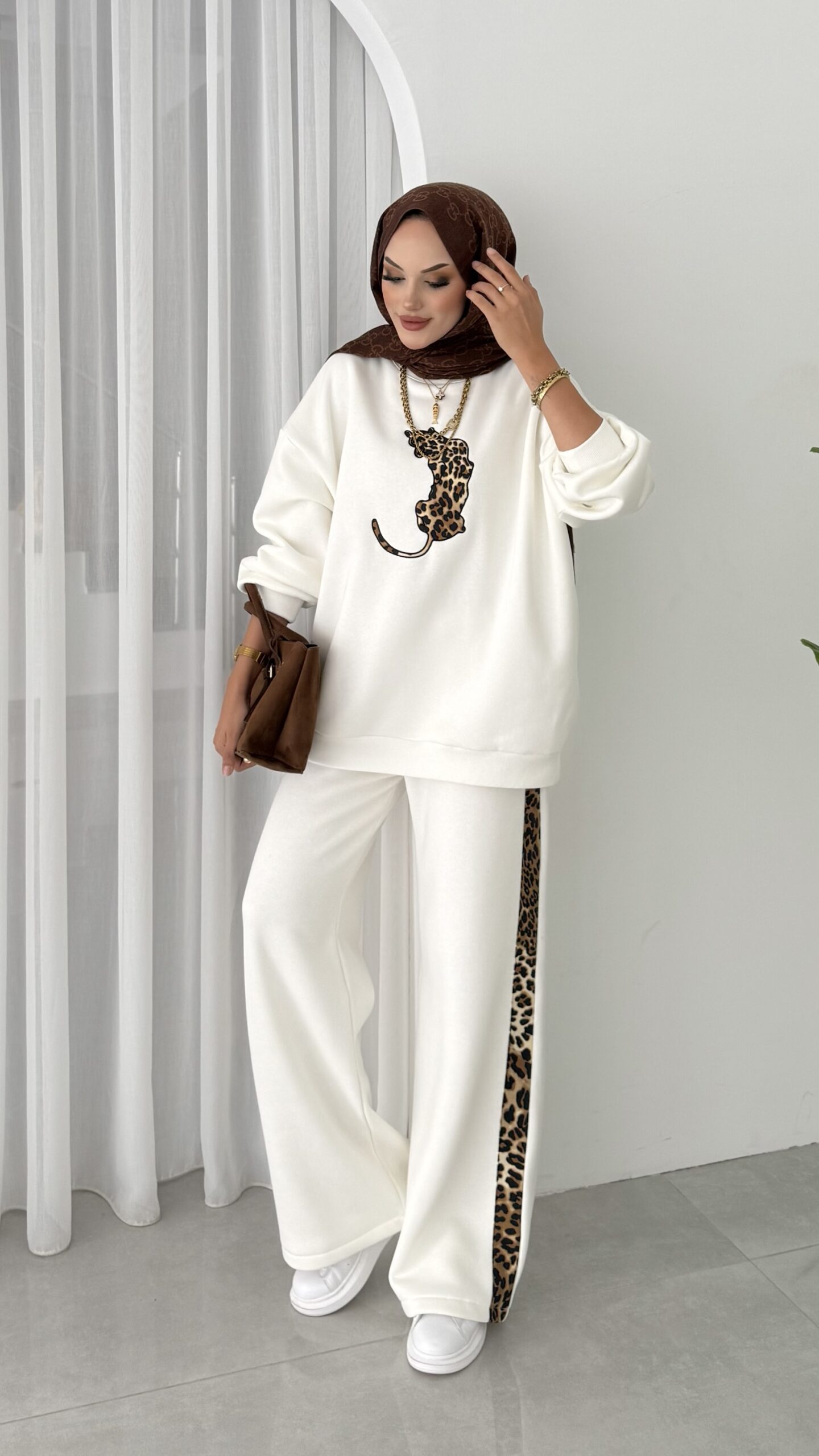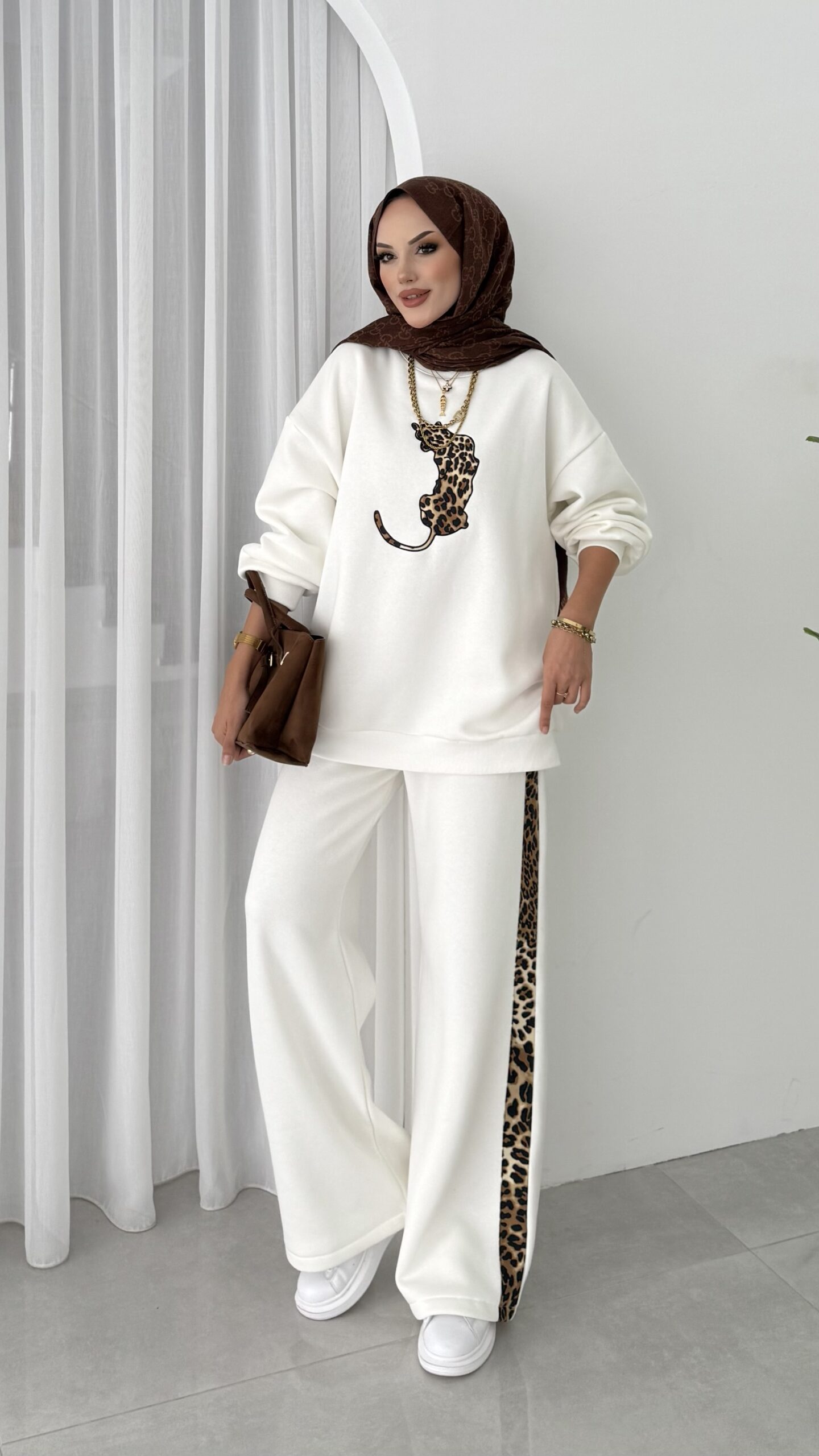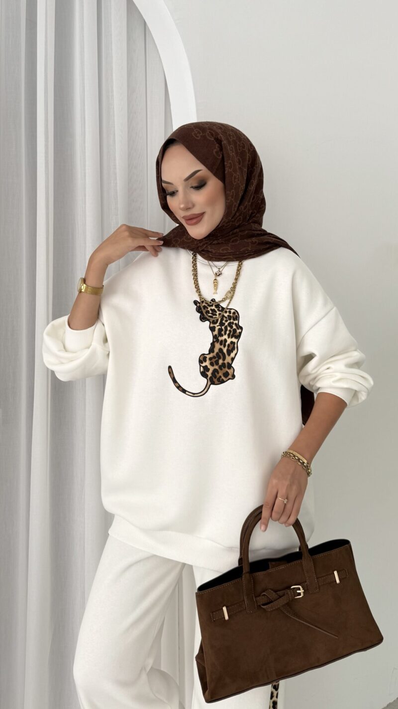 Leopar Nakışlı Şardonlu İkili Takım – Beyaz