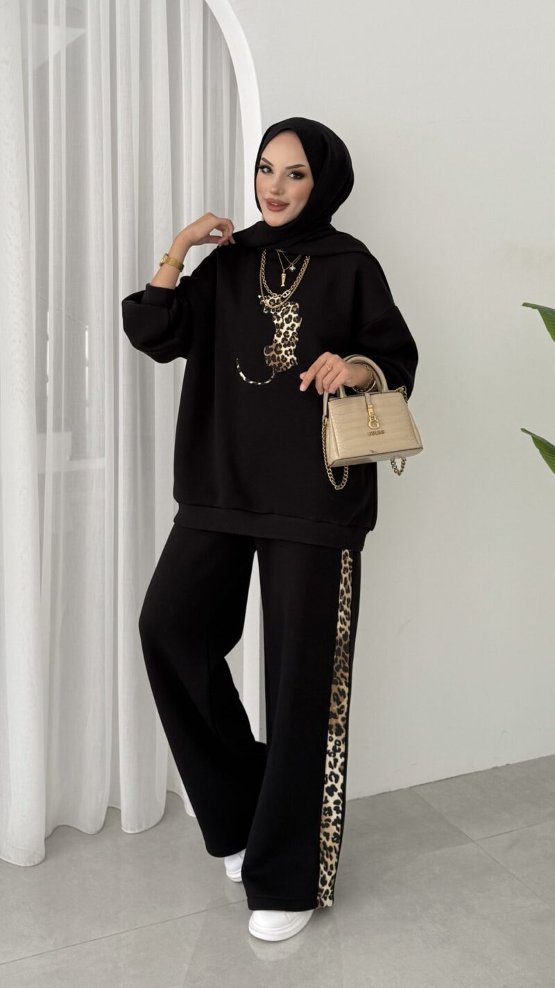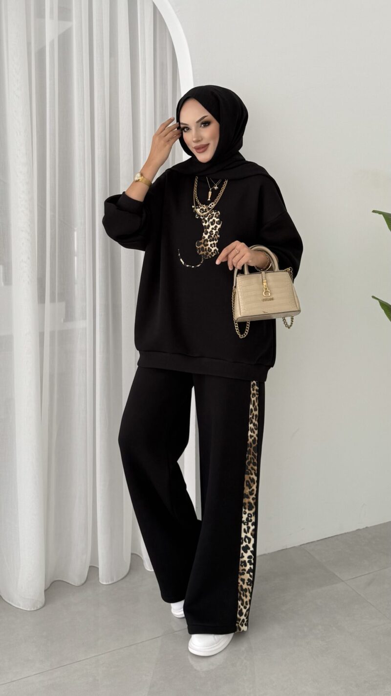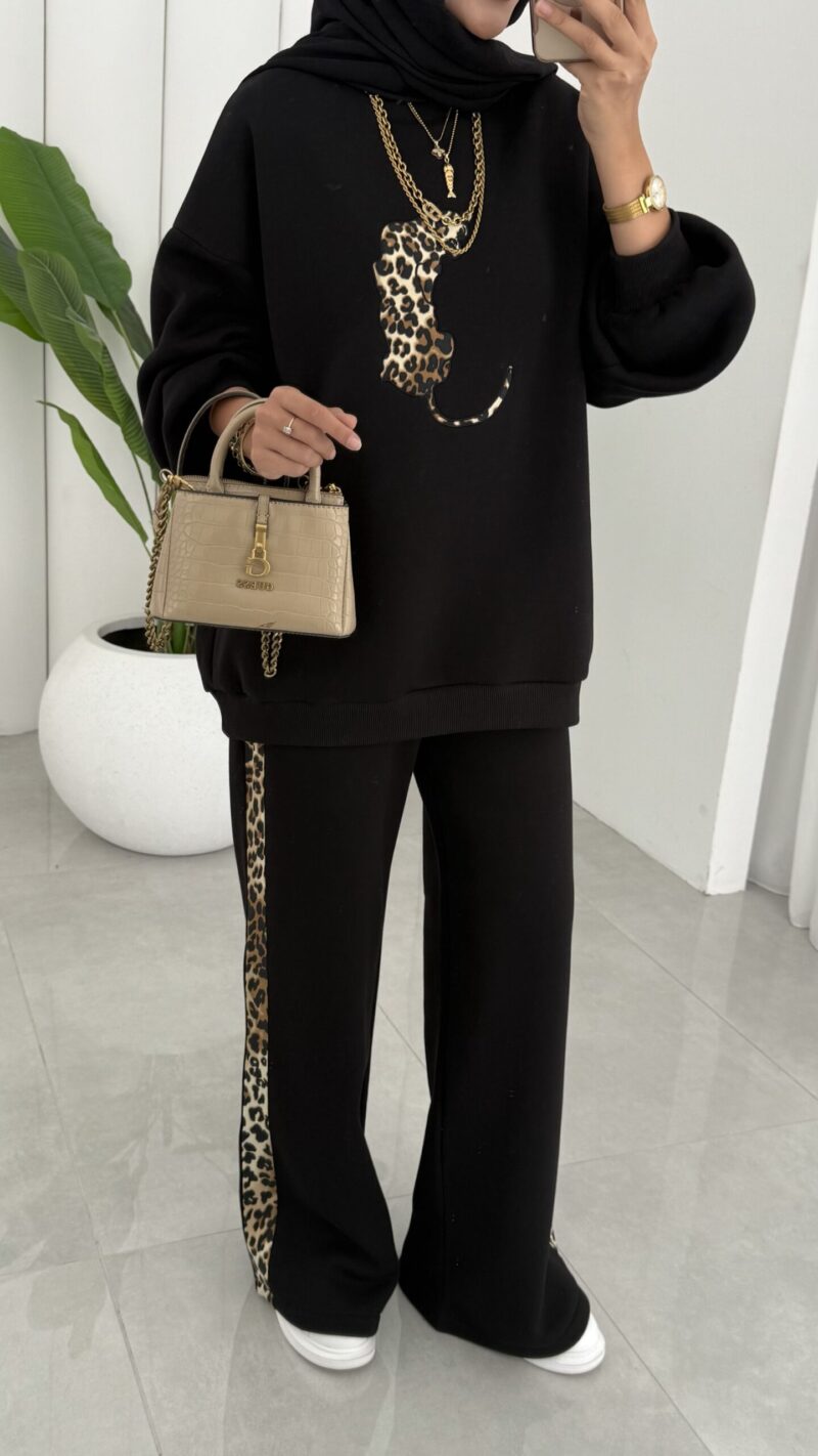 Leopar Nakışlı Şardonlu İkili Takım – Siyah