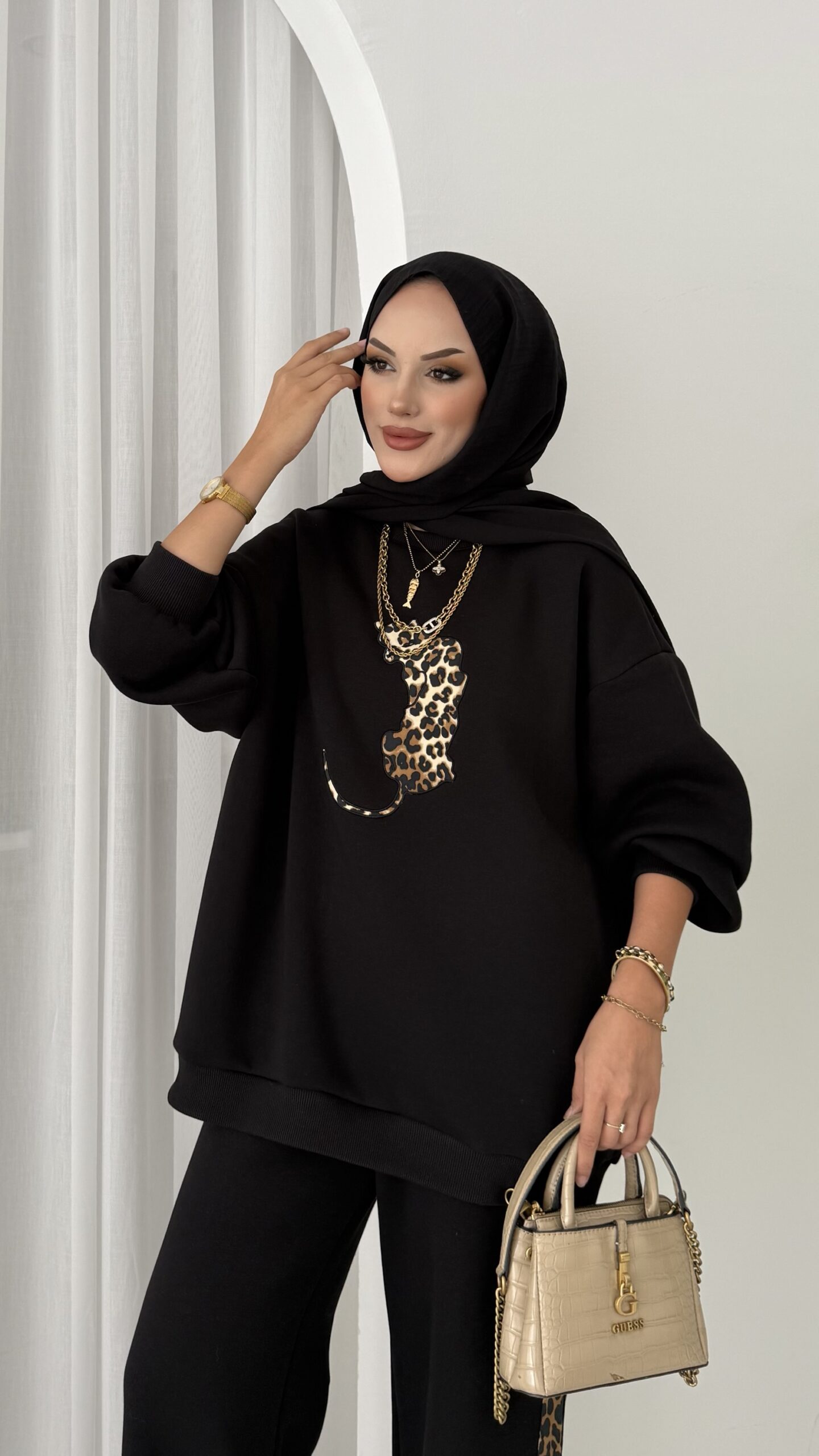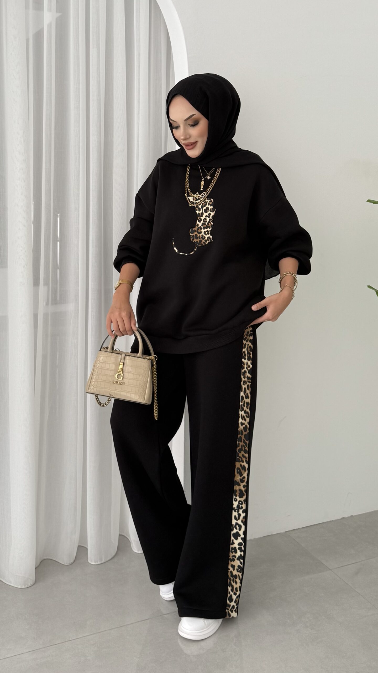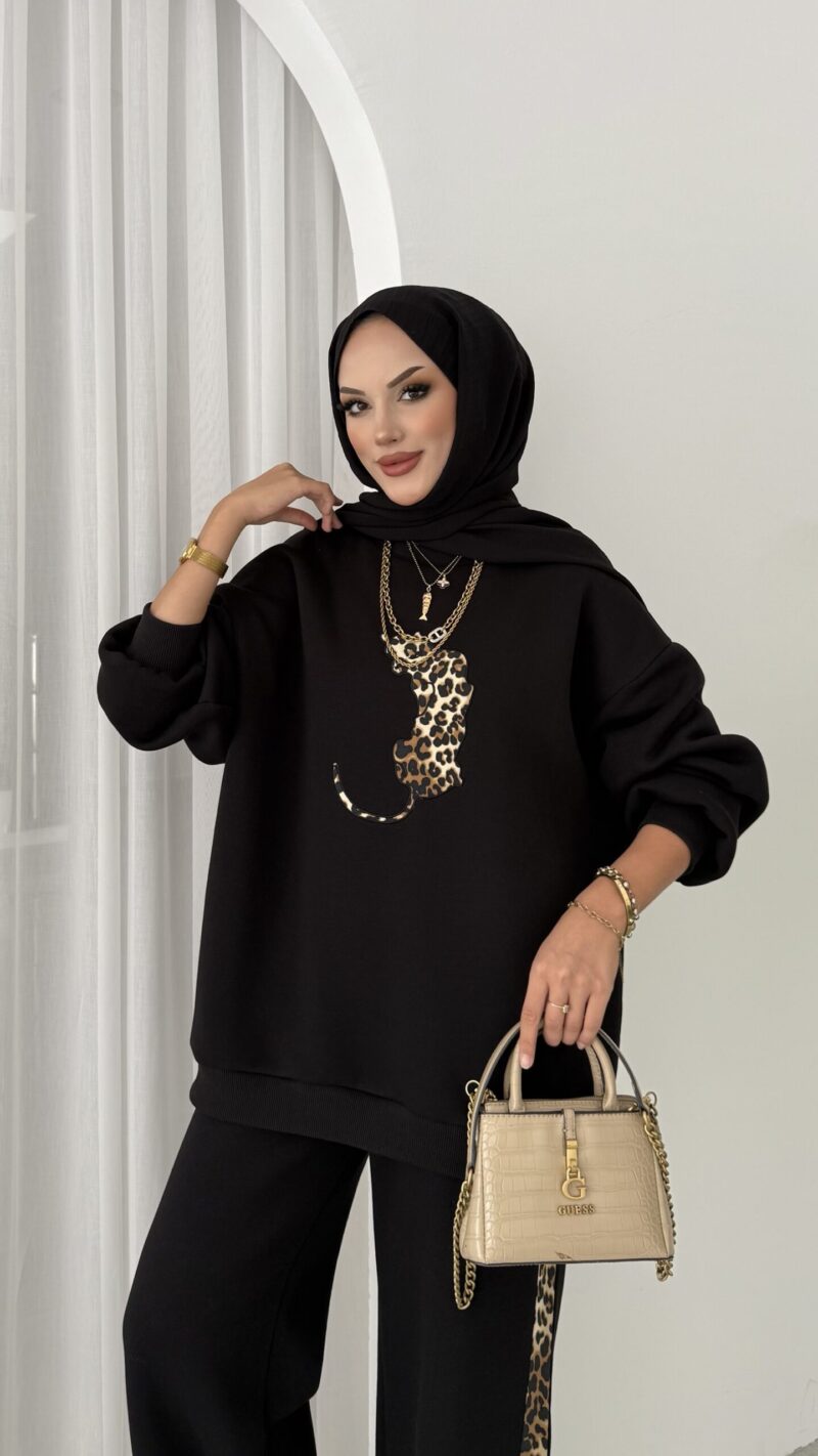 Leopar Nakışlı Şardonlu İkili Takım – Siyah