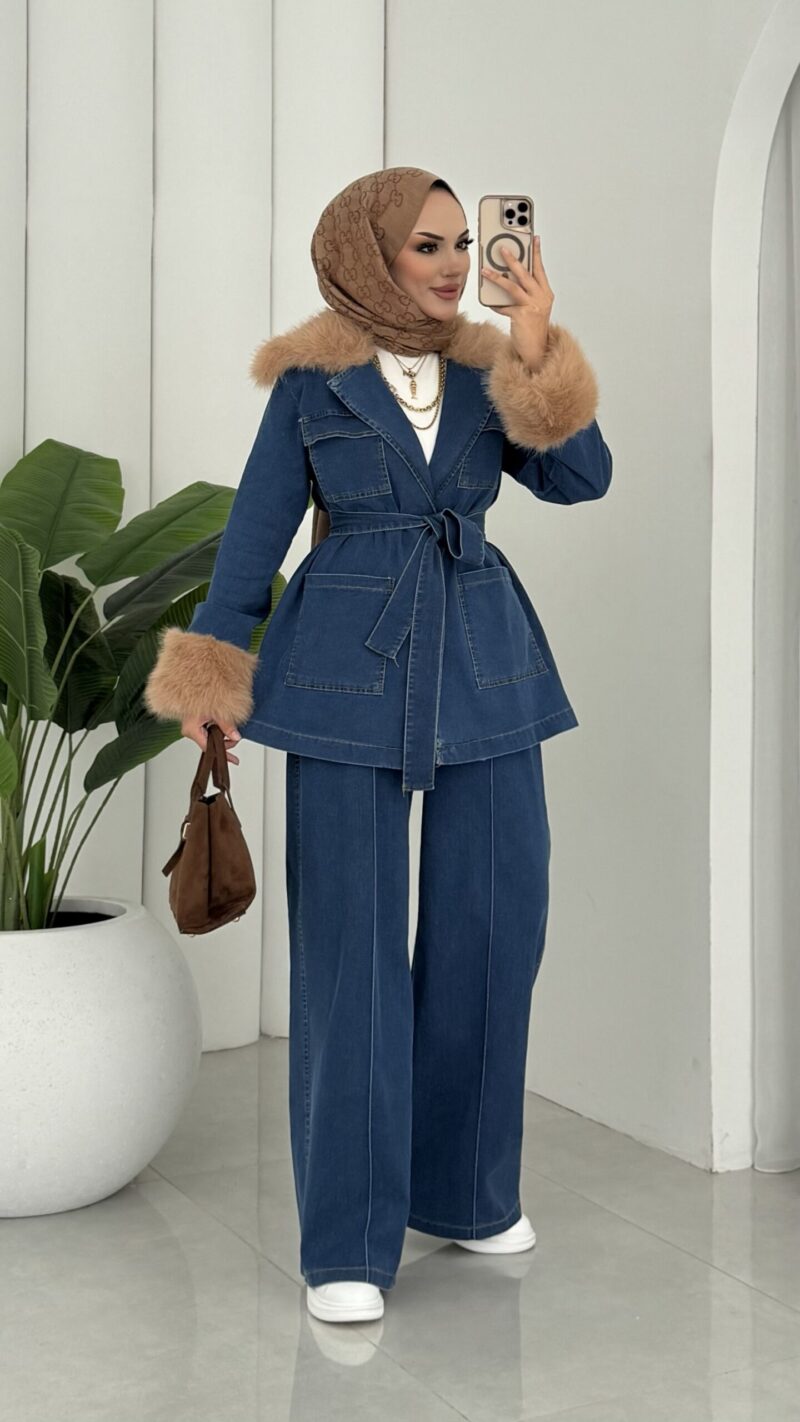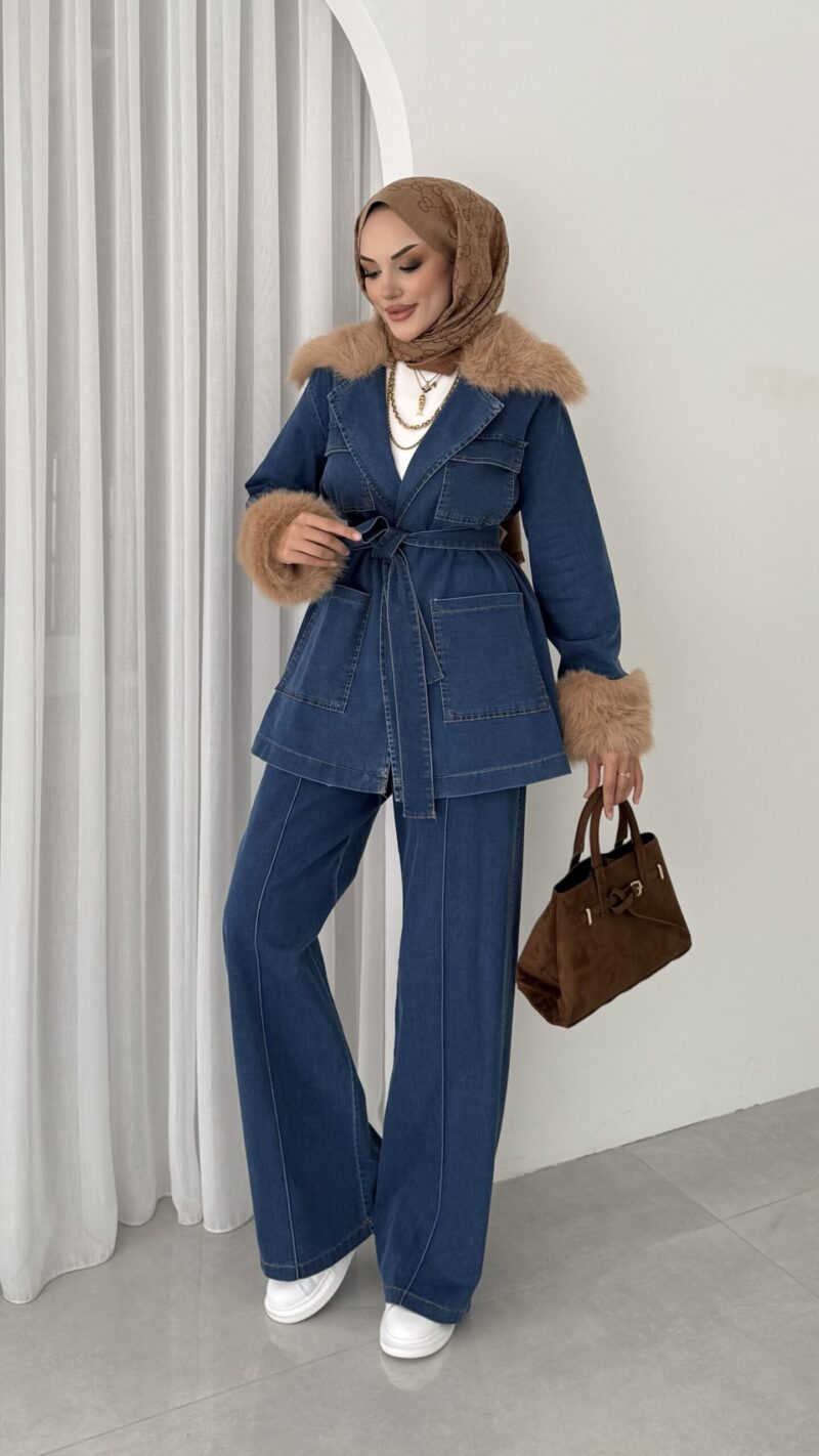 Luxury Kürklü Denim İkili Takım – Açık Mavi