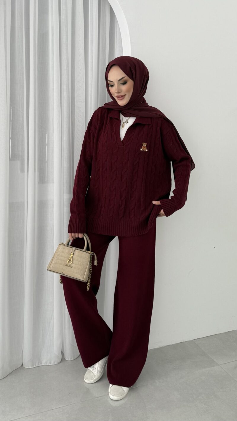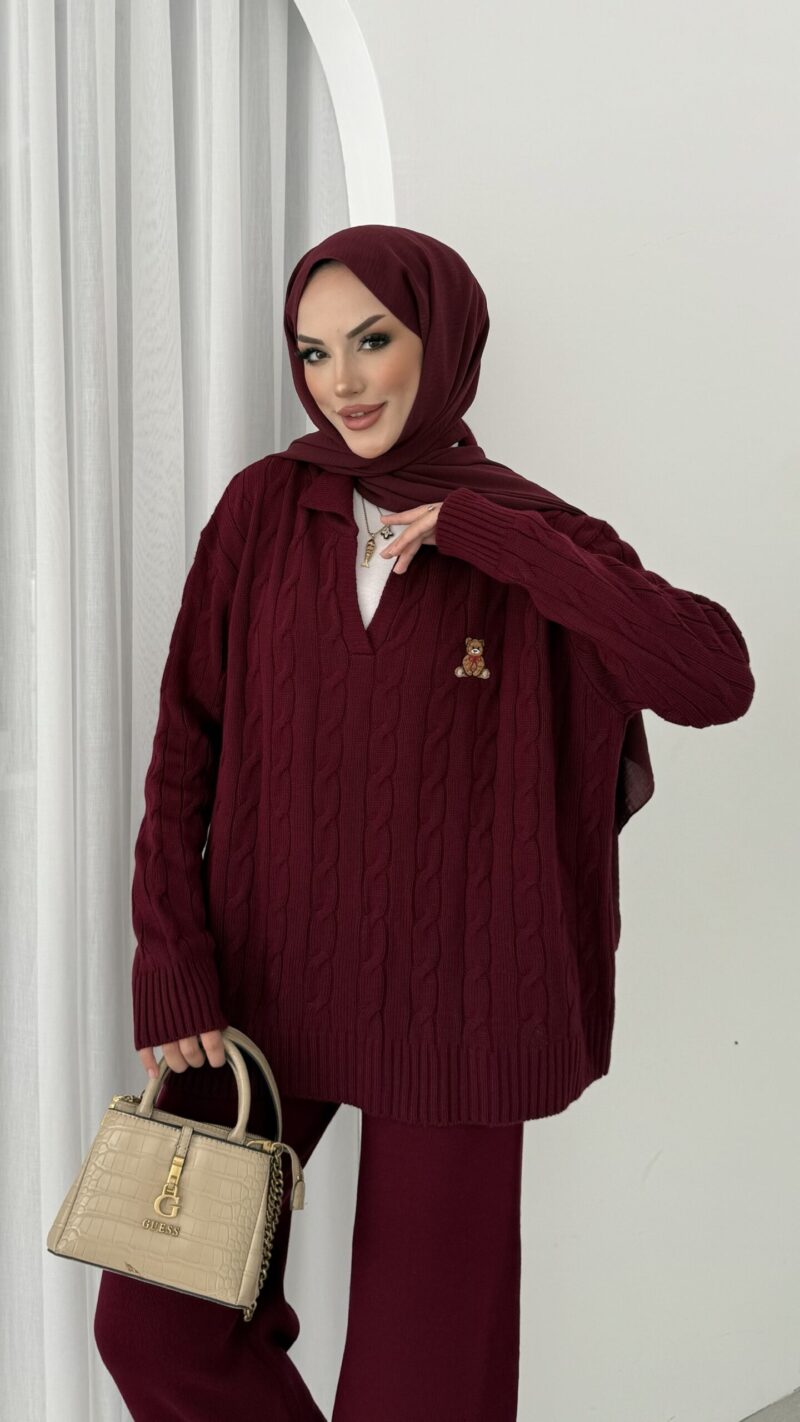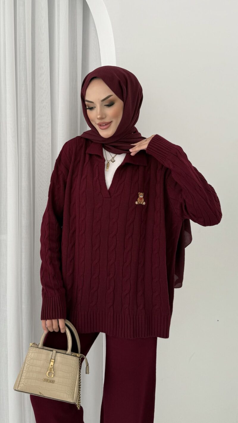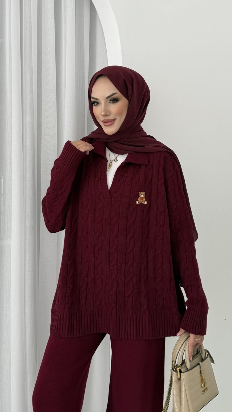 Muadil Ayıcık Nakışlı Triko İkli Takım – Bordo