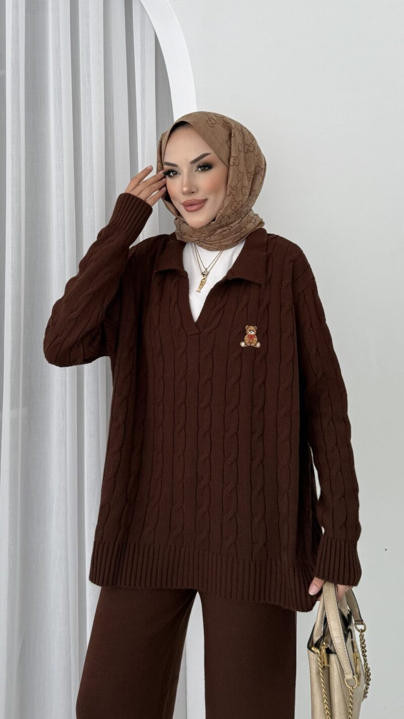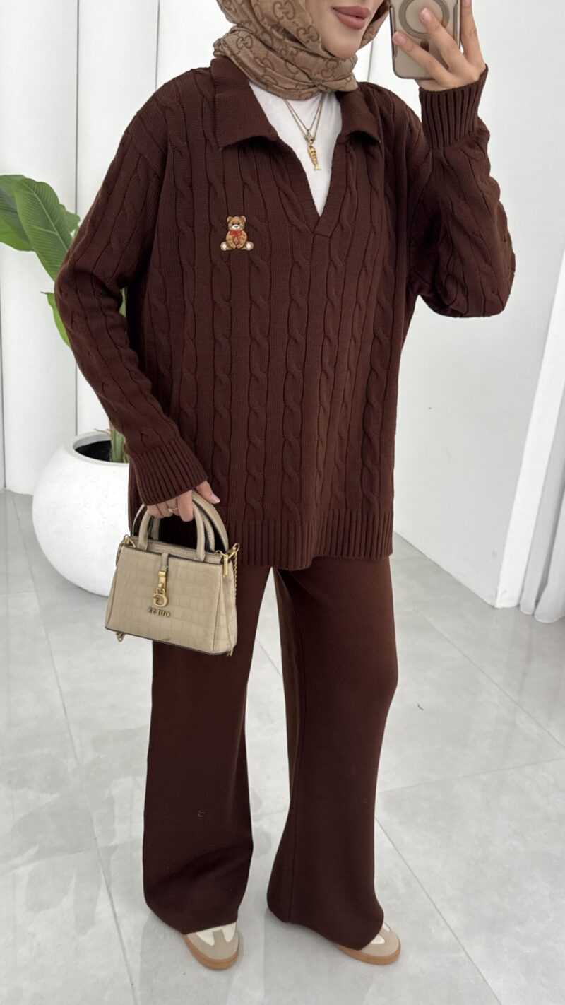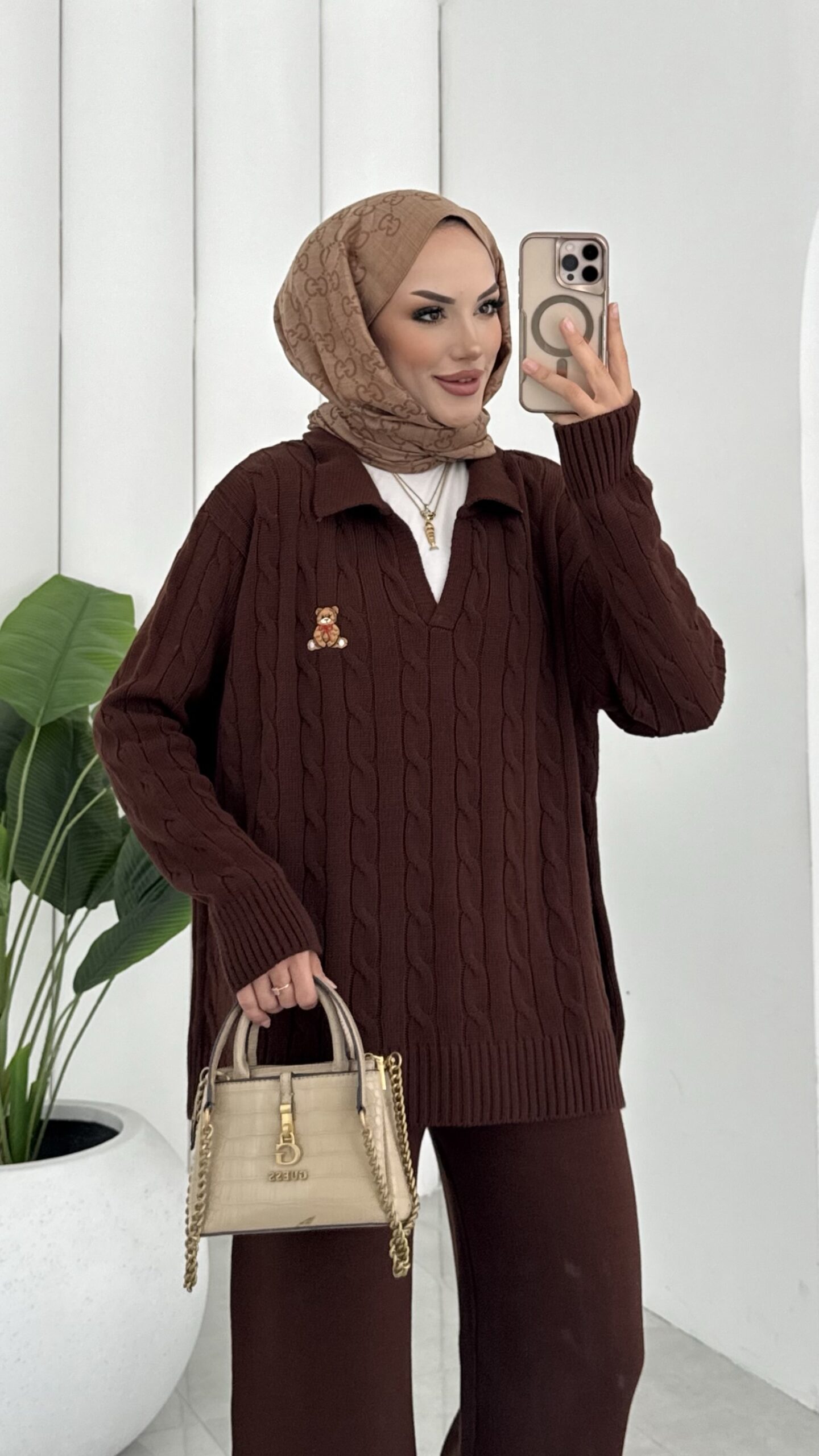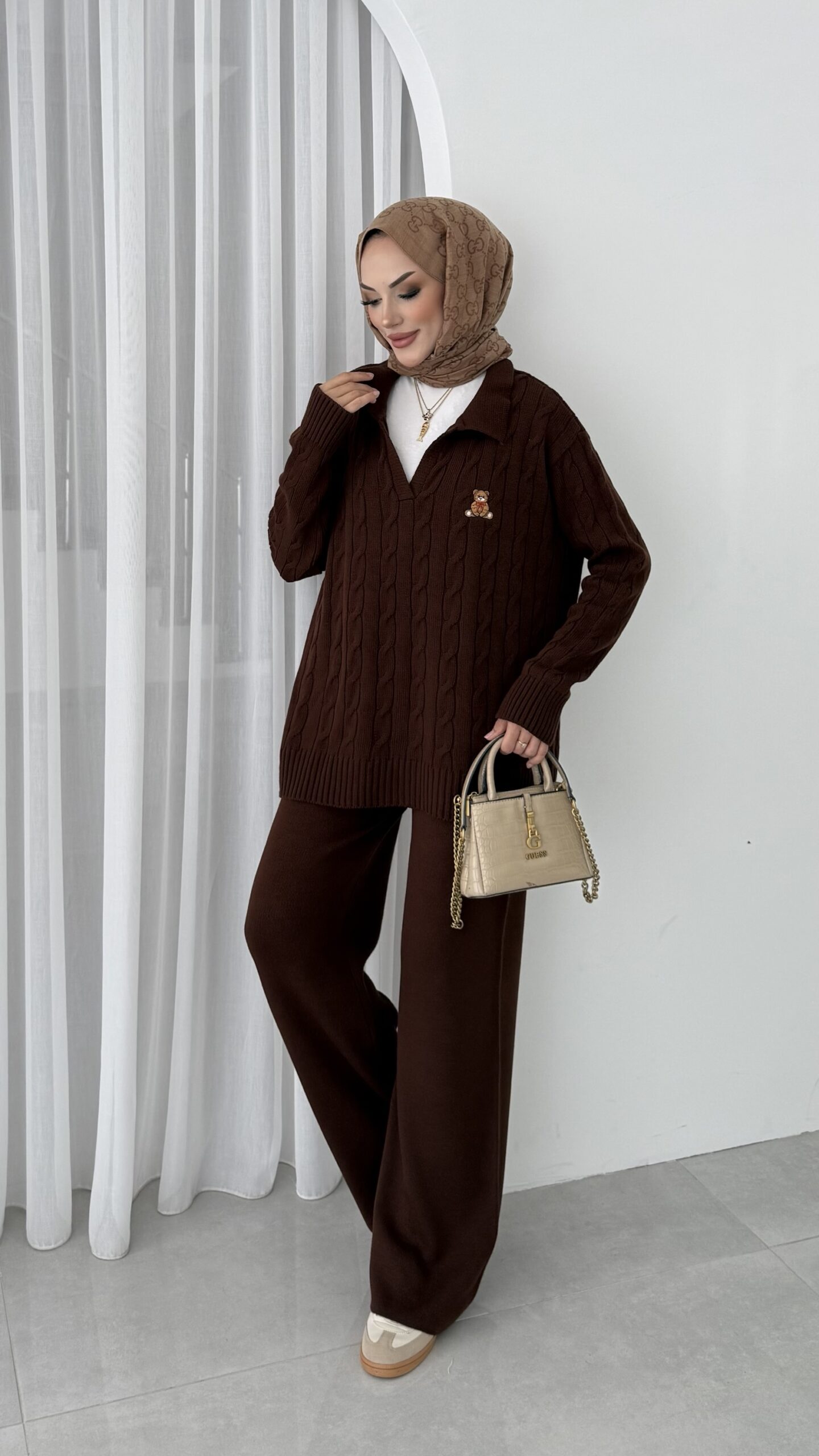 Muadil Ayıcık Nakışlı Triko İkli Takım – Kahverengi