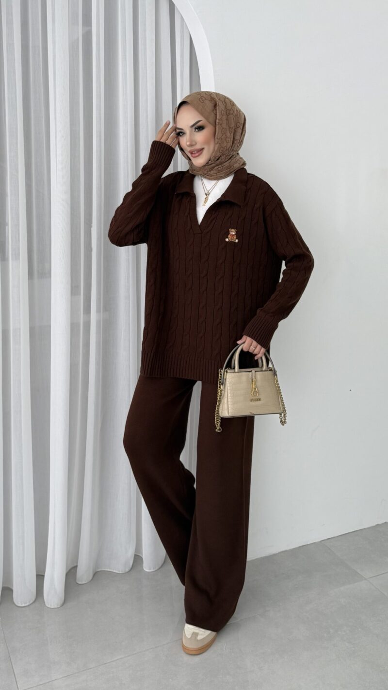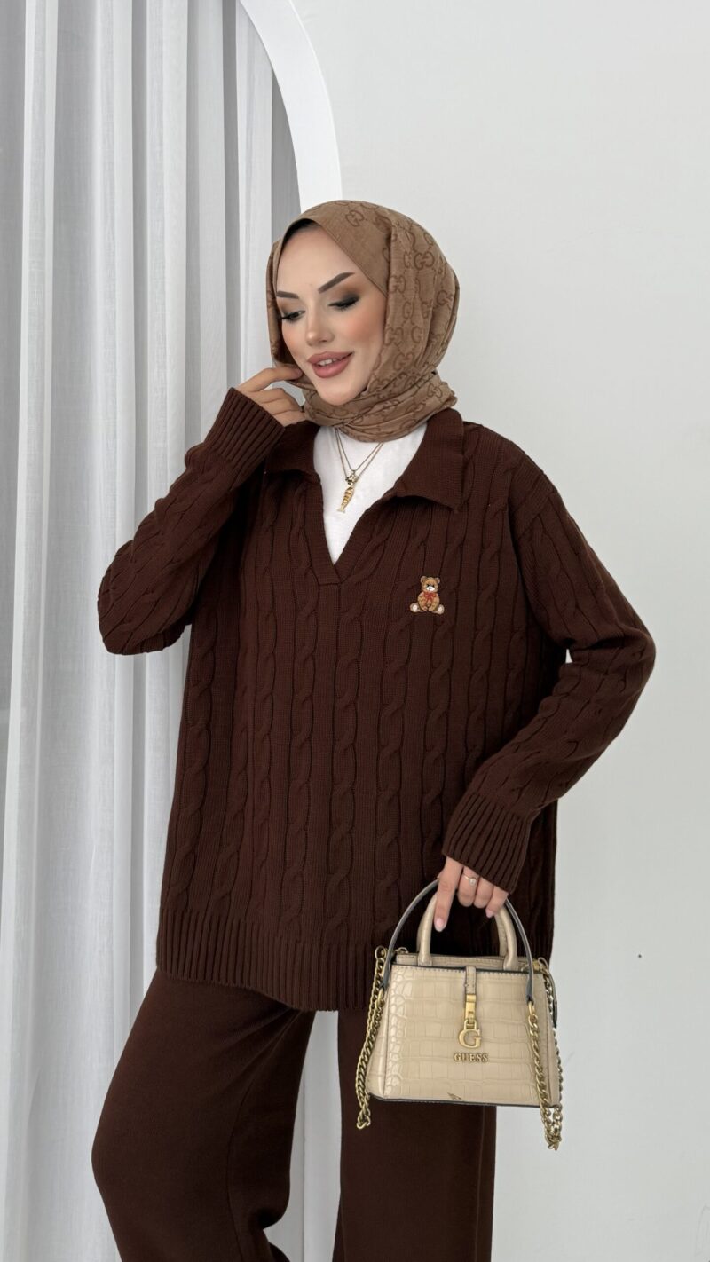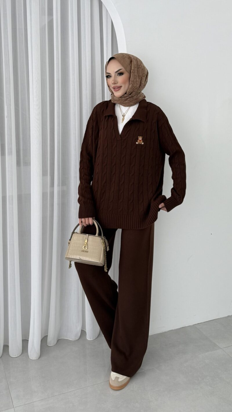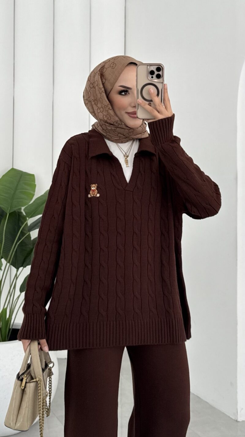 Muadil Ayıcık Nakışlı Triko İkli Takım – Kahverengi