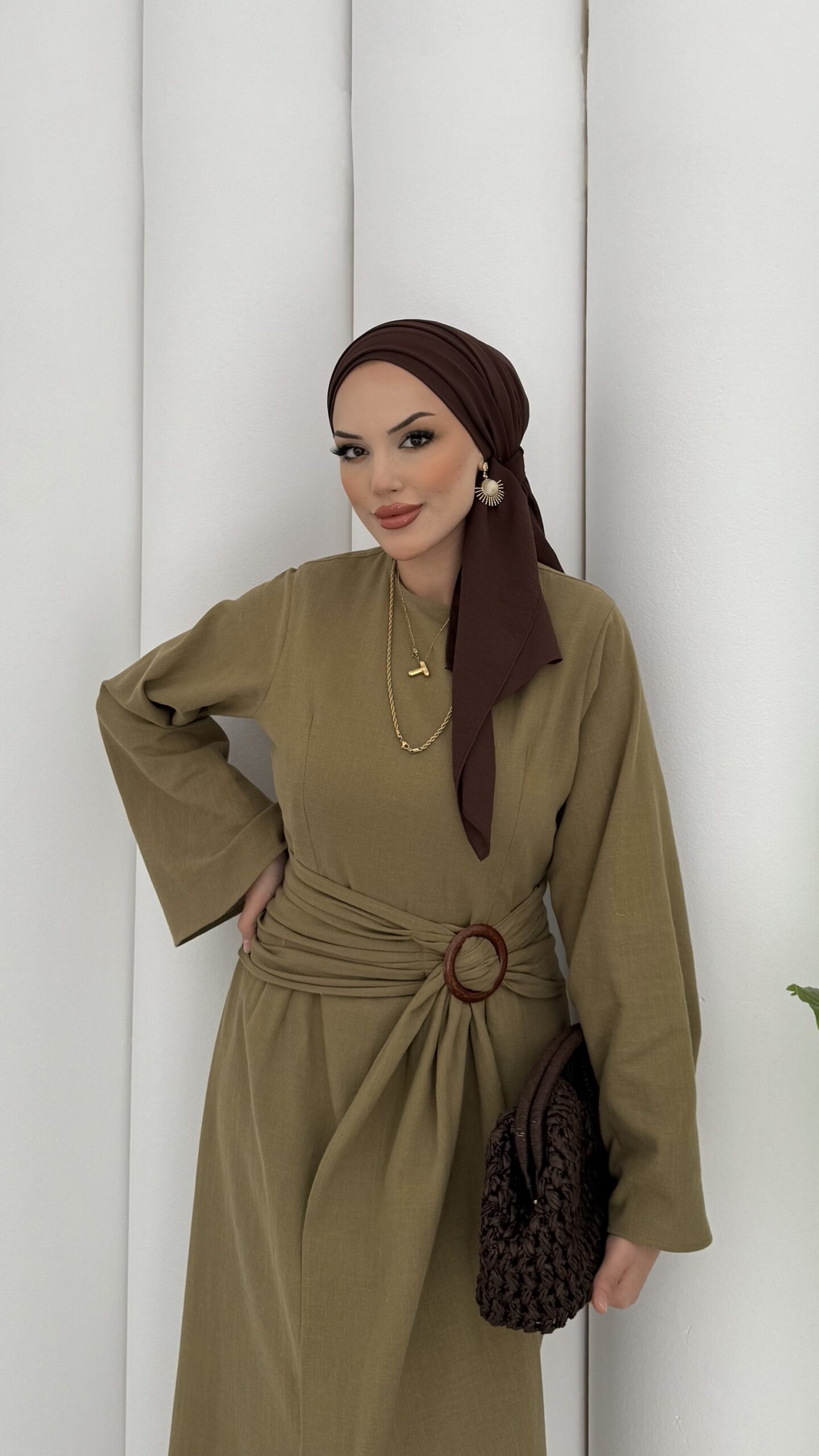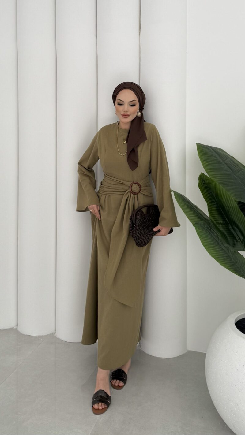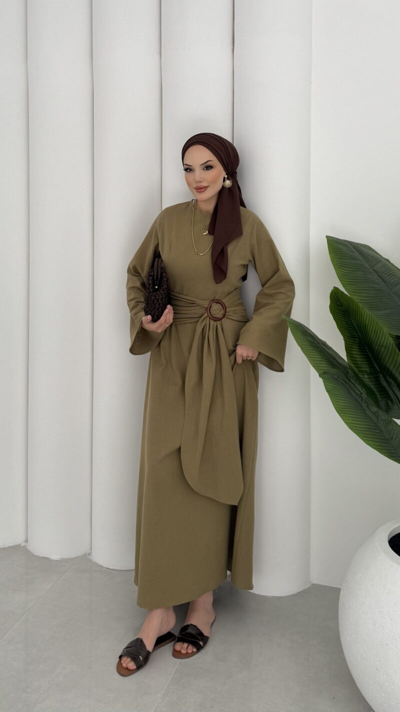 Pinterest Toka Detaylı Keten Elbise – Haki