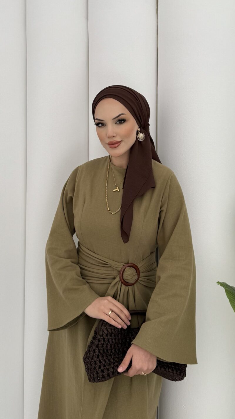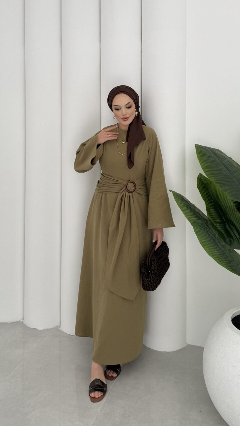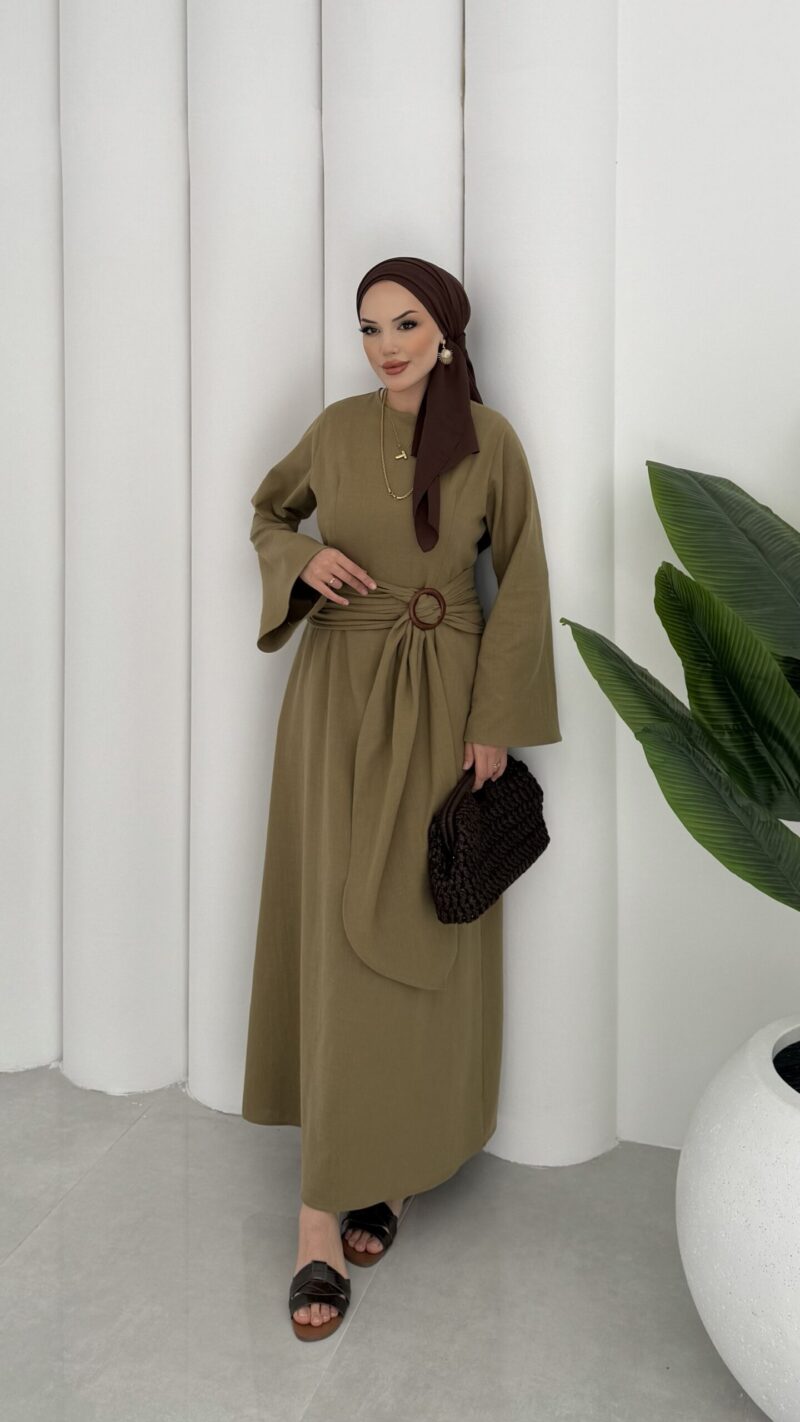 Pinterest Toka Detaylı Keten Elbise – Haki