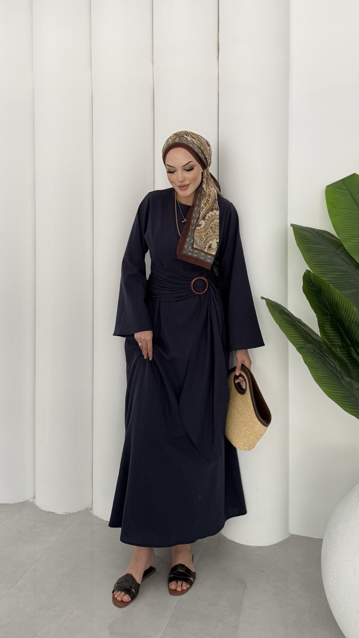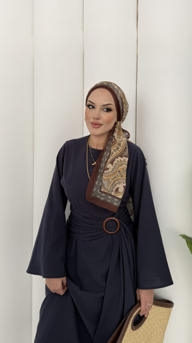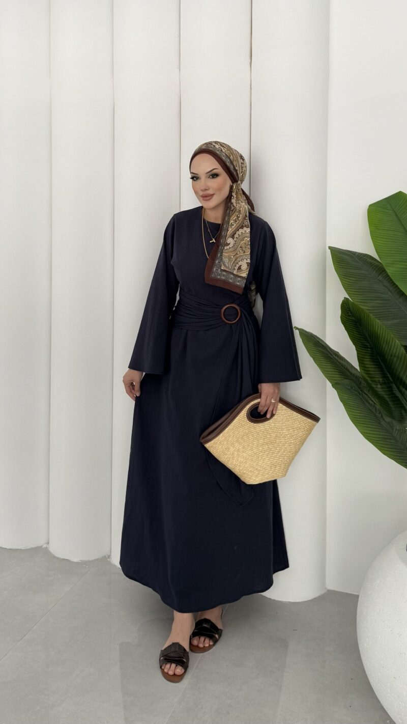 Pinterest Toka Detaylı Keten Elbise – Lacivert